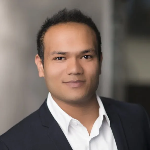 Portrait of a man in a dark suit and white shirt, smiling with a blurred background.