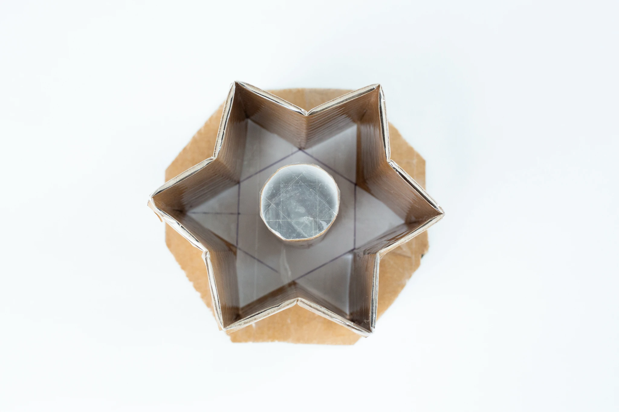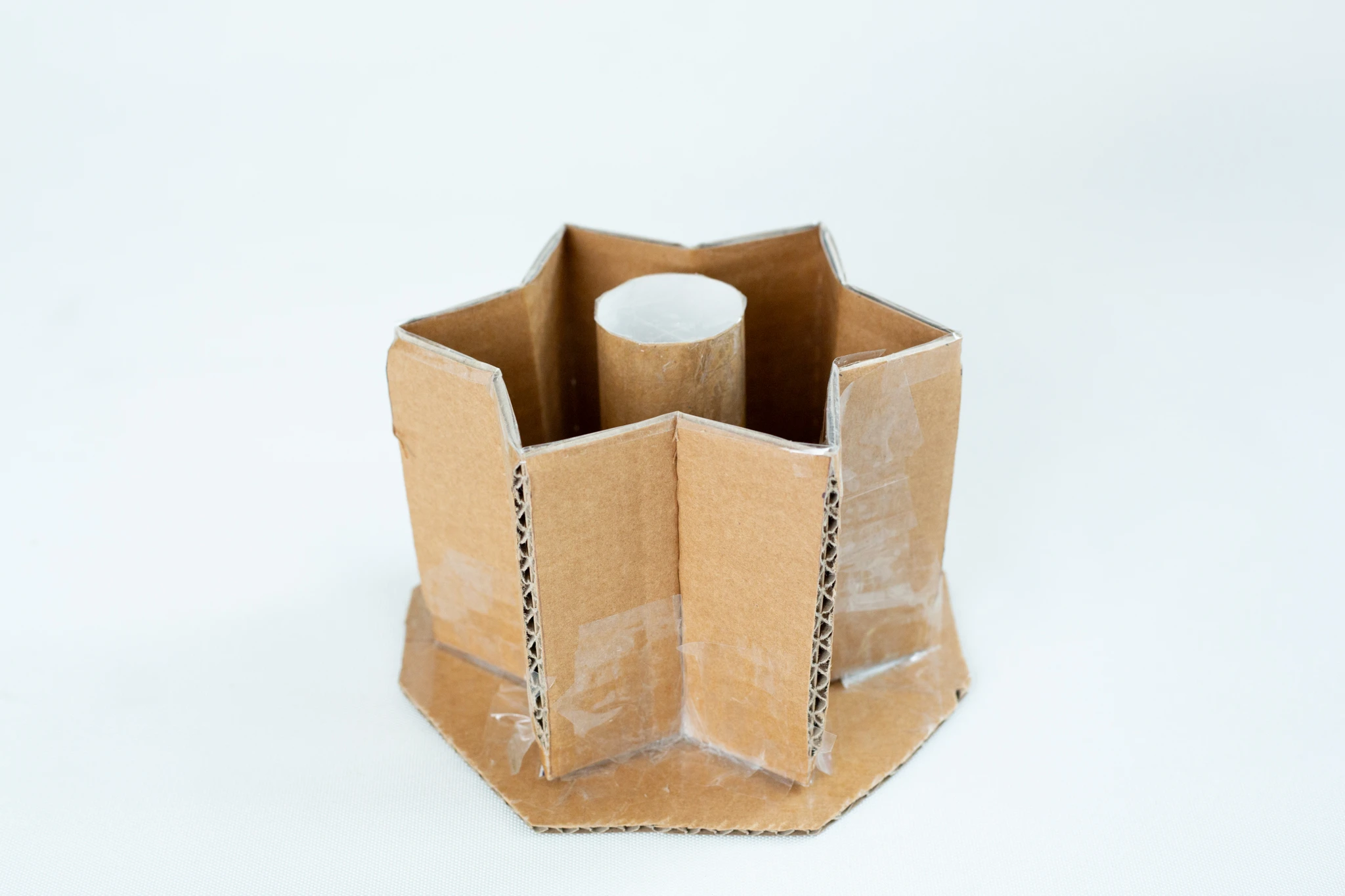 - Align the first edge of the cardboard perpendicular with an edge of the paper star and tape it down. Using a ruler to push the tape down can help ensure the wall sits flush with the base. Repeat the process with each wall.